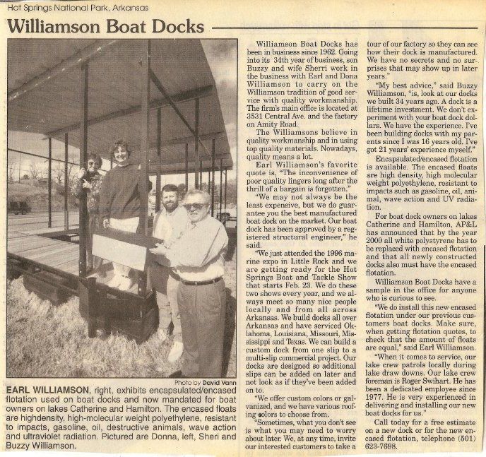 Through the sixty-two years of business, Williamson Boat Docks, Inc. has made thousands of customers happy by offering a quality product at a reasonable price. Word-of-mouth has been the best advertisement,
