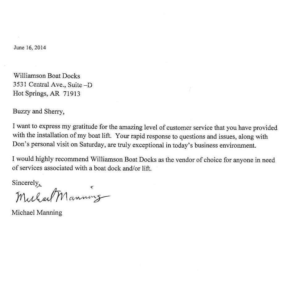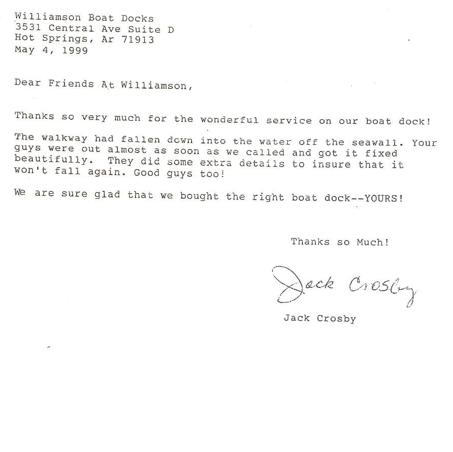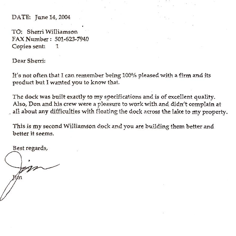 ... Buzzy and Sherri Williamson made us feel welcome and relaxed. We asked about the restrictions Entergy had and they explained everything to us in detail... He (Buzzy) went over all the materials that they used and that everything was of "premium" quality. We then talked about their crew that would actually be building the dock. He explained that the crew did exceptional work under their Foreman's overview. Buzzy told me that he would handle all the permits and would work up a materials list and give us a bid. We accepted, and now, we are the proud owners of the best looking boat dock in our cove! Everything that was talked about in our conversations was carried out exactly as stated. We are the proud to say that Williamson Boat Dock Builders built our boat dock! There were no corners cut. Their dock crew was second to none. And we can now say the Williamson's are our friends, instead of just another boat dock builder.