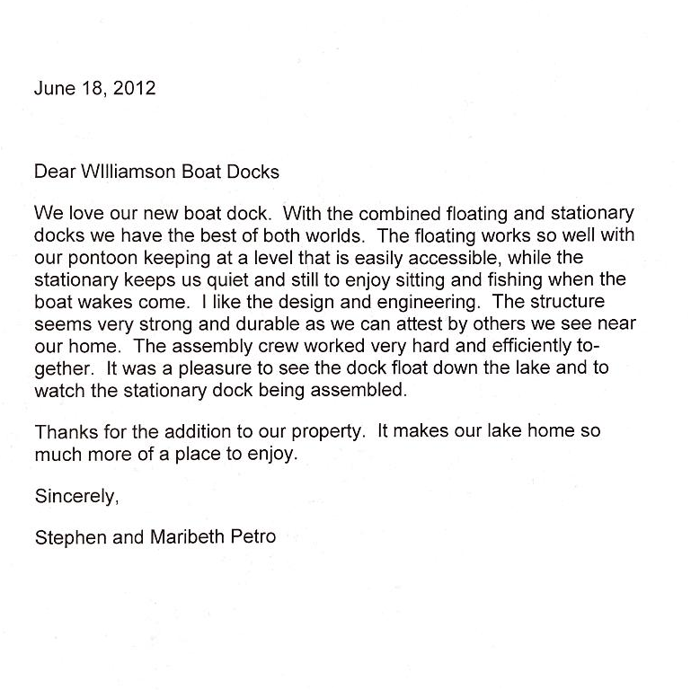 Williamson Boat Docks Inc. again delivered such great craftsmanship installing our boat dock this last past fall. I would highly recommend this company to anyone interested in having a state of the art and dependable dock installed to enjoy over their lifelong journey. Thanks again!
